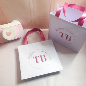 Sacola de Papel para Compras de Boutique com Estampagem a Quente, Mini Sacola de Luxo para Roupas, Festa de Natal, Presente, Rosa e Branca, Personalizada com Alça de Fita